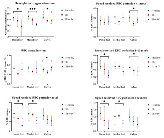 Speed-resolved RBC perfusion total also showed a difference between the three groups and was statistically different on the dorsal (p = 0.016) and medial (p = 0.043) sides of the foot but not on the calf (p = 0.057). Among the speed ranges, the lowest speed region (<1 mm/s) did not show a difference between the groups; however, in the higher speed ranges (1–10 mm/s and >10 mm/s), a statistically significant decrease was observed in both speed ranges for the dorsal side of the foot (p = 0.023 and p = 0.015, respectively).