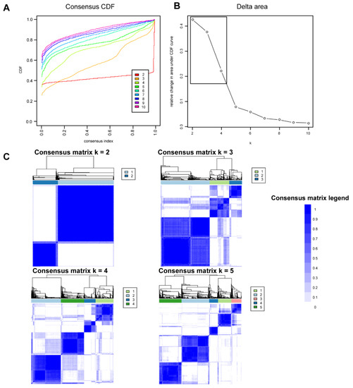 - Wilkerson, M.D.; Hayes, D.N. ConsensusClusterPlus: A class discovery tool with confidence assessments and item tracking. Bioinformatics 2010, 26, 1572–1573. [Google Scholar] [CrossRef] [PubMed] [Green Version]