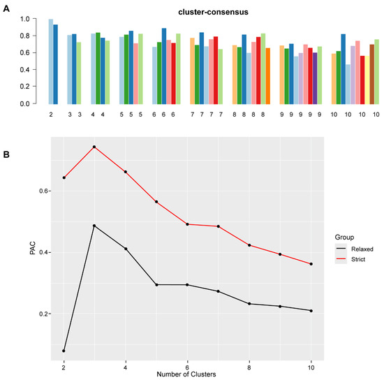 (A) The bar plot represents the mean consensus score for different numbers of clusters (K ranges from two to ten). (B) The PAC values assess ambiguously clustered pairs.