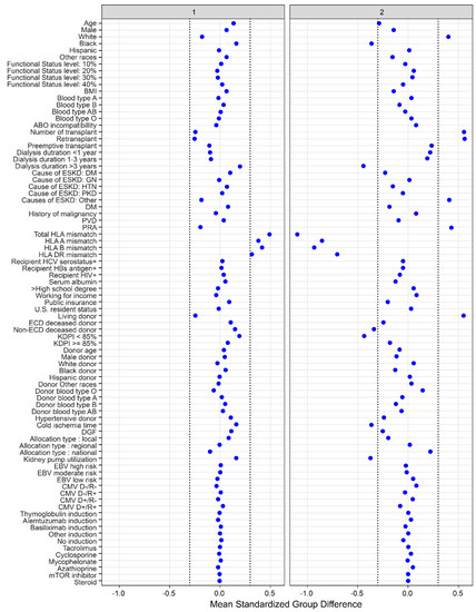 The standardized differences across two clusters for each of baseline parameters. The x axis is the standardized differences value, and the y axis shows baseline parameters. The dashed vertical lines represent the standardized differences cutoffs of <−0.3 or >0.3. Abbreviations: BMI: Body mass index, CMV: Cytomegalovirus, D: Donor, DGF: Delayed graft function, DM: Diabetes mellitus, EBV: Epstein–Barr virus, ECD: Extended criteria donor, ESKD: End stage kidney disease, GN: Glomerulonephritis, HBs: Hepatitis B surface, HCV: Hepatitis C virus, HIV: Human immunodeficiency virus, HLA: Human leukocyte antigen, HTN: Hypertension, KDPI: Kidney donor profile index, mTOR: Mammalian target of rapamycin, PKD: Polycystic kidney disease, PRA: Panel reactive antibody, PVD: Peripheral vascular disease, R: Recipient.