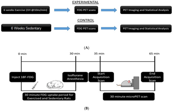 Experimental timelines: (A) Animals were divided into exercise and sedentary groups. Exercise animals received 6 weeks of exercise, while sedentary animals remained in their home cages. All animals underwent PET scans after the conclusion of 6 weeks. (B) Timeline of PET procedure: Animals were injected with [18F]-Fluorodeoxyglucose (FDG) via intraperitoneal injection. They were returned to their home cages for a 30-min uptake period. At the end of the uptake period, animals were anesthetized and placed in the bed of the PET R4 tomograph machine. PET scans lasted 30 min. After the scan, animals were recovered and returned to their home cages.