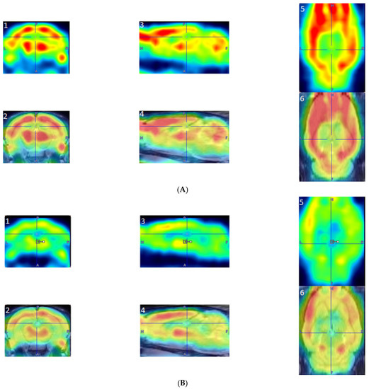 Examples of reconstructed PET images manually co-registered to an fMRI template. (A) PET image from an exercised rat: A1, Coronal PET image, exercised rat; A2, coronal co-registered image, exercised rat; A3, sagittal PET image, exercised rat; A4, sagittal co-registered image, exercised rat; A5, horizontal PET image, exercised rat; and A6, horizontal co-registered image, exercised rat. (B) PET images from a sedentary rat: B1, coronal PET image, sedentary rat; B2, coronal co-registered image, sedentary rat; B3, sagittal PET image, sedentary rat; B4, sagittal co-registered image, sedentary rat; B5, horizontal PET image, sedentary rat; and B6, horizontal co-registered image, sedentary rat.