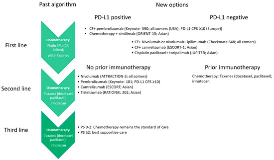 | Keynote-590 [14] | III | Asian (53%) Western (47%) | ESCC (73%), EAC (14.8%), GEJA Siewert I (12.1%) | CF CF + pembrolizumab | 376 373 | Median OS: ESCC and PD-L1 ≥ 10:13.9 vs. 8.8 months, HR: 0.57, p < 0.0001 ESCC: 12.6 vs. 9.8 months; HR: 0.72; p: 0.0006 PD-L1 ≥ 10:13.5 vs. 9.4 months; HR: 0.62; p < 0.0001 entire study population: 12.4 vs. 9.8 months; HR: 0.73; p < 0.0001 PD-L1 < 10:10.5 vs. 10.6 months; HR 0·86 median PFS: ESCC: 6.3 vs. 5.8 months, HR: 0.65, p < 0.0001; PD-L1 ≥ 10:7.5 vs. 5.5 months, HR: 0.51, p < 0.0001; PD-L1 < 10:6.2 vs. 6 months; HR: 0.8; all patients: 6.3 versus 5.8 months, HR: 0.65, p < 0.0001. |