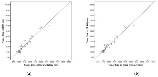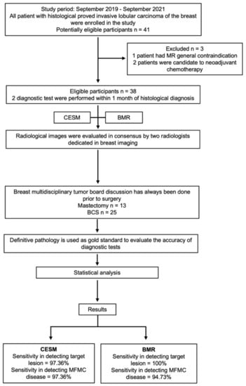 For statistical analysis of the pathology report, we considered the maximum diameter of target lesion and the presence of MFMC. The sensitivity of CESM and BMR in detecting target lesions (previously identified through conventional breast imaging examination and histologically proved as CLI) is defined as the proportion of cases in which a target lesion is correctly visualized as pathological enhancement area.