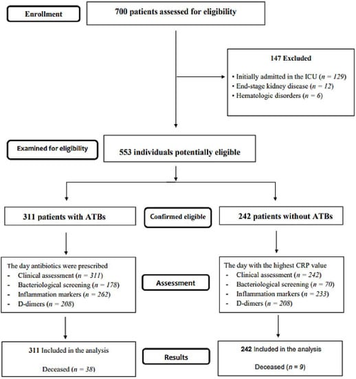 - Moretto, F.; Sixt, T.; Devilliers, H.; Abdallahoui, M.; Eberl, I.; Rogier, T.; Buisson, M.; Chavanet, P.; Duong, M.; Esteve, C.; et al. Is there a need to widely prescribe antibiotics in patients hospitalized with COVID-19? Int. J. Infect. Dis. 2021, 105, 256–260. [Google Scholar] [CrossRef]