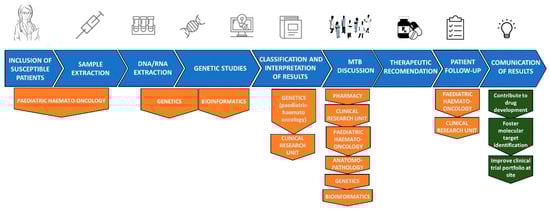 This personalised medicine committee comprised the expertise of a wide range of professionals, including paediatric oncologists, pathologists, pharmacists, geneticists, bioinformatics, clinical trial experts and basic researchers. Figure 1 represents a schematisation of the work flow from the moment of sample extraction to the committee’s final decision and successive steps.