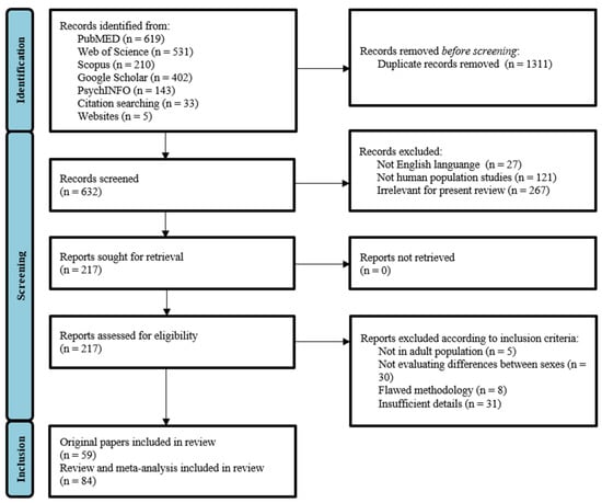 Electronic database searches, alongside supplemental searching strategies, yielded a total number of 1943 records (Figure 1). After removing the duplicates, 632 studies remained for further examination. A first selection was performed based on titles and short abstract screening, narrowing down the range to 217 records. All articles that examined sex differences were retained, even if this was not the primary focus of the study, as long as the search terms were mentioned in the publication title, abstract, or subject headings. Then, two reviewers (V.B. and L.D.) independently restricted the analysis to those articles that met the inclusion criteria. The reviewers reached consensus and performed the final selection procedure including inspection of overall study quality and risk of bias. This resulted in a total number of 143 eligible articles, including 59 original papers and 84 reviews and meta-analyses. All remaining papers were read in full.