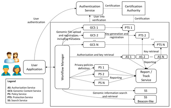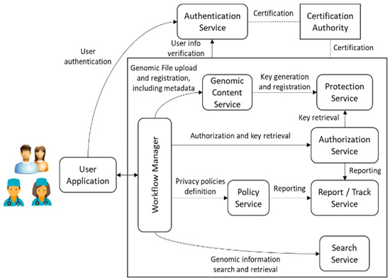 - Delgado, J.; Llorente, S.; Reig, G. Implementation of privacy and security for a genomic information system. In pHealth 2021—Proceedings of the 18th International Conference on Wearable Micro and Nano Technologies for Personalized Health—Genoa, Italy, 8–10 November 2021; Blobel, B., Giacomini, M., Eds.; Studies in Health Technology and Informatics Series; IOS Press: Amsterdam, The Netherlands, 2021; Volume 285, pp. 253–258. Available online: https://ebooks.iospress.nl/doi/10.3233/SHTI210609 (accessed on 8 February 2022).