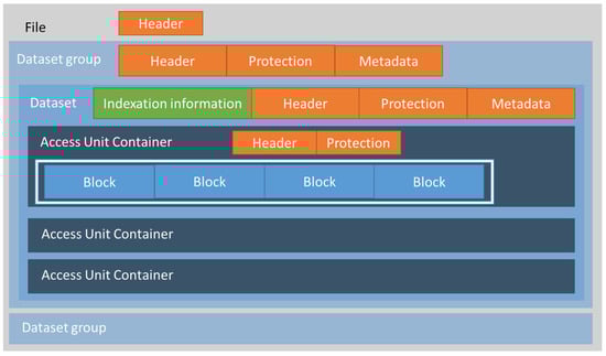 In order to support the security strategies proposed in ISO/IEC 23092, a hierarchical file format was defined, as shown in Figure 5. This file format combines protection and metadata elements with the genomic data. It is worth noting the security and privacy using the design approach taken into account in the definition of this file format.