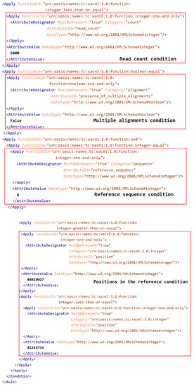 The methods defined in the API also use other attributes. For example, in GetDataBySimpleFilter, the user can select whether multiple alignments [41] should be considered in the returned result. Filtering can be relevant to the privacy rules (most notably when used to delimit the returned region of the genome); therefore, in our proposal, this should also be included in the request. This translates, for example, into an attribute with its ID equal to presence_of_multiple_alignments.