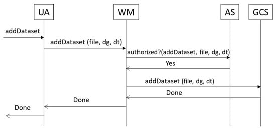 GCS manages ISO/IEC 23092 file hierarchy creation and management. The hierarchy is also stored in the database, to support searches over file structure and metadata. It also manages XML information derived from metadata and protection files. For the specific case of XML metadata files, their content is parsed and inserted in the database, so searches can be performed with SS. AS is used in order to authorize operations. Only the file creation operation does not require authorization, as it creates a new file, but the rest of the operations modifying the hierarchy (for instance, addDatasetGroup, editAnyElement or deleteAnyElement) should be authorized before they can be performed. In this case, several checks should be implemented, including file ownership.