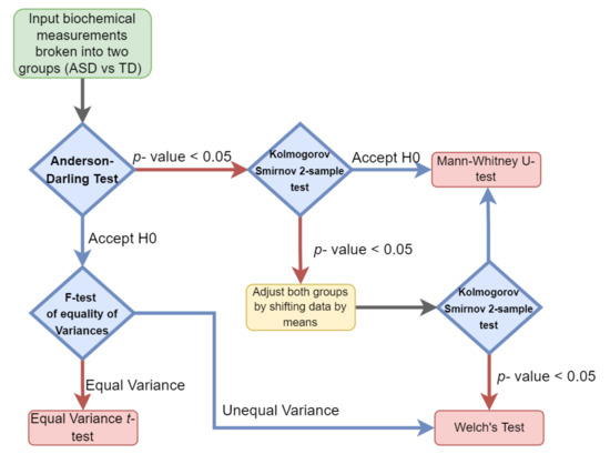 Hypothesis testing was performed by evaluating the type of distribution for each of the cohorts’ measurements and then selecting the appropriate parametric or nonparametric test. The normality and variance of each individual clinical measurement variable were determined for both the ASD and TD groups separately. When the normality assumption was determined to hold true for both groups, a parametric test was performed. Either an equal variance t-test or Welch’s test (unequal variance t-test) was performed depending on if the variance observed was significantly different between the groups (Figure 1).