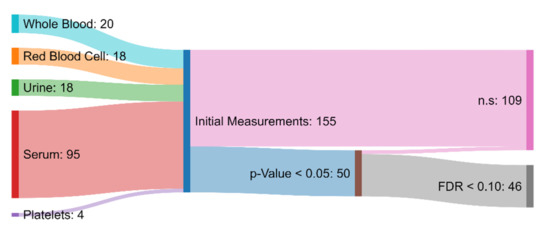 Sankey diagram showing the biochemical and xenobiotic measurements that served as the inputs to the hypothesis testing protocol. Measurements that had a p-value greater than 0.05 or a false discovery rate greater than 0.10 were deemed to not be significantly different (n.s.) between the ASD and TD groups. The measurements that were determined to be significant were used in the development of the FDA and SVM models.