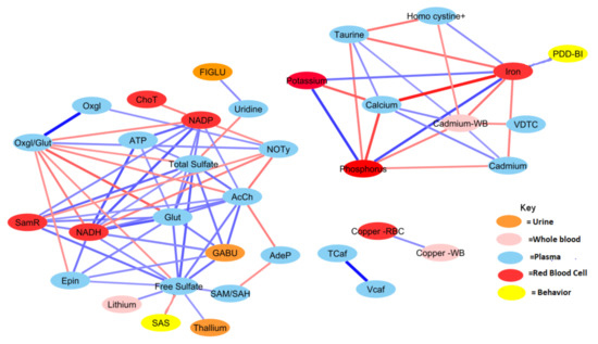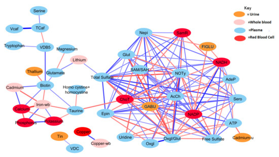 Correlation network between significant biochemical and xenobiotic compounds in the ASD cohort (strength of the correlation is visualized by the line thickness, positive correlations are in blue and negative correlations are in red). In order for a relationship to be deemed significant, the correlation coefficient had to be greater than 0.35, FDR less than 0.10, and the p-value less than 0.05. In total, 212 significant correlations (106 pairs) were observed. Acetylcholine had the greatest number of relationships, with 14 significant relationships (see Table A2 for details).