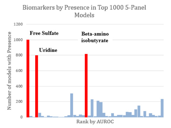 Marker prevalence among the top-1000 FDA 5-marker models as judged by their performance on the test set. Among the most prominent potential biomarkers are free sulfate, uridine, and beta-amino isobutyrate (highlighted in red). Each of these was present in more than 75% of the top models. Free sulfate in particular was present in every single top model.