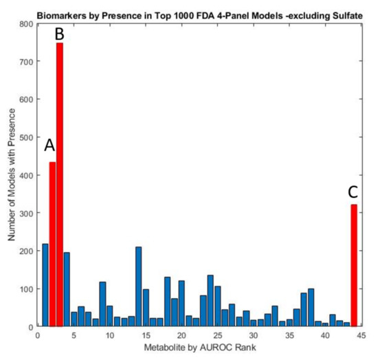 The majority of the top-1000 performing FDA models tended to share the same markers of interest. All three of the markers observed to constitute the optimized three-variable model (free sulfate, uridine, and beta-amino isobutyrate) were also found in all other optimized models as well (Figure 5). Given the relatively high AUROC ascribed to free sulfate in plasma and total sulfate in plasma, FDA assessments that included these two metabolites as part of the model discovery process tended to skew toward the inclusion of these metabolites in biomarker panels.