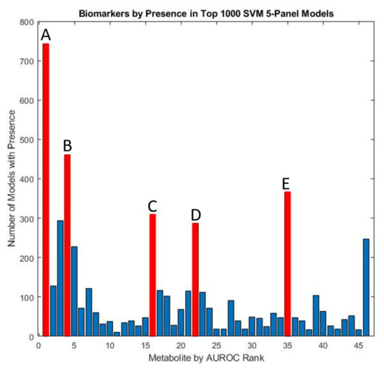 In order to carry out a more thorough assessment of the remaining significant metabolites, the two sulfate measures were excluded to examine the efficacy of panels consisting of other potential biomarkers. An exhaustive analysis of all possible remaining four-variable model panels, with leave-one-out cross-validation was performed to determine the biomarkers which occurred most frequently in the top-1000 models. (Figure 6). These models were subsequently utilized to derive a five-variable model that maximized performance after cross-validation (Table 2). The optimized five-variable model was able to perform comparably to some sulfate-containing models albeit with lower CV AUROC (0.95 vs. 0.98).
