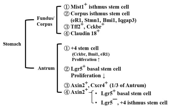 In the isthmus area of the antrum, several +4 antral stem cells have been detected and are specified by biomarkers: cholecystokinin B receptor (Cckbr), muscle intestine and stomach expression 1 (Mist1), Bmi1, and estrogen receptor 1 (eR1). In general, these stem cells can proliferate more rapidly than antral Lgr5+ stem cells [27,28,29,30,31].
