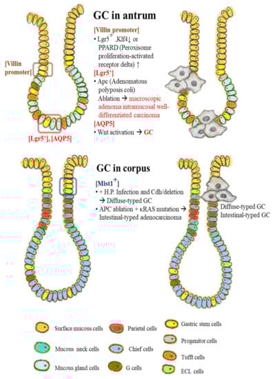 Representative stem cells are grouped in the stomach. Stem cells in both the antrum and fundus/corpus were assigned by the specific biomarkers as defining the stem cells, and these stem cells and progenitor cells can be mutations of the oncogene and the tumor suppressor genes to induce the neoplasia program.