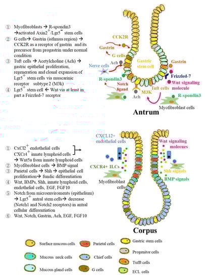 The mesenchymal effect in the glands has been less well-studied. The immune or stromal cells present in the gastric epithelium are included as the additional environmental effects for gastric stem cells. Both Cxcl2+ endothelial cells and Cxcr4+ innate lymphoid play roles in the niches of the corpus stem cells, in part via secretion of Wnt5a from innate lymphoid cells [34]. R-spondin 3 is produced from myofibroblasts and is a critical factor of the antral stem cell niche, and thus mainly activates Axin2+/Lgr5− stem cells [28]. Gastrointestinal hormones, including gastrin and acetylcholine, may affect the function of the antral stem cell niche. Gastrin is produced from G cells near the antral isthmus, and Cck2R is the receptor for gastrin and progastrin under normal status. Cck2r+ stem cells have been identified in this area, and progastrin, but not gastrin, can enhance the growth of Cck2r-expressing stem cells [72]. Acetylcholine generated by tuft cells in the gastric epithelium controls the DNA synthesis, and regeneration of the gastric epithelial cells, as well as clonal expansion of Lgr5+ stem cells through the muscarinic receptor subtype 2 (M2R) [45,63].