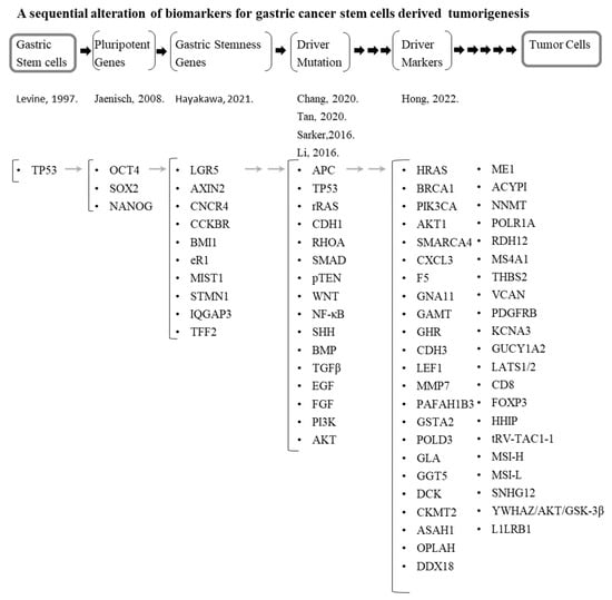 More recently, researchers and clinicians have incorporated data from TCGA and GEO to screen for target biomarkers and described a summary list of the possible candidate markers [7]. However, there remain several challenges in utilizing these markers in clinical applications. Here, we review the results of searching for the biomarkers for progression of GCs. Based on stemness reprogramming, the TP53 mutation was examined [86], and stemness genes such as octamer-binding transcription factor OCT4, sex determining region Y-box transcription factor 2 (SOX2), and homeobox protein NONOG were addressed in GC cells or tissues [87]. Based on these three representative stemness factors, we next searched for stemness genes in GSCs in the antrum, fundus, and corpus regions (Lgr5, Axin2, Cxcr4, Cckbr, Bmi1, eR1, Mist1, Stmn1, Iqgap3, Tff2, and Cckbr; Figure 1 and Table 1 and Table 2) and examined the mutations in these basal and specific stemness-related genes. Thus, the combination of stemness genes and stomach stemness genes should be critical for searching for the relevant biomarkers. Next, we examined the driver mutation of the oncogenes and tumor suppressor genes, as well as the DNA mutation genes described in Section 5 and Table 1. In addition, alterations of microsatellites are critical for the induction of GC. The combined mutations and the altered expression of these marker combinations might become new biomarkers, but there are no reports so far identifying a link between these mutations. Nonetheless, this approach is required for identifying the roadmap of GC initiation and progression. A summary of the series of biomarkers possibly linked to the development process for a commitment to GC is presented (Figure 4).