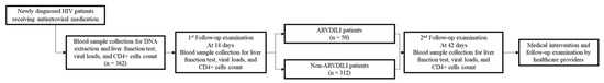 Four hundred and forty-seven study participants, including 362 PLHIV and 85 healthy controls, were enrolled (Figure 1). PLHIV were categorized into 50 ARVDILI cases and 312 non-ARVDILI cases. The inclusion criteria for non-ARVDILI PLHIV were as follows: (i) the patient agreed to sign an informed consent form after thoroughly considering the study protocol, (ii) male or female patients aged between 18–70 years old, (iii) a certified laboratory procedure confirmed the patient with HIV-1 infection, and (iv) the patient has never been received any antiretroviral treatment medication. The exclusion criteria for this group were as follows: (i) the patient requested to be excluded from the study, (ii) HIV-infected patient must breastfeed, (iii) the patient has ever received other HIV treatment medication, (iv) the patient’s liver enzymes were more than five times the upper limit of normal. Under Thailand National Guidelines on HIV/AIDs Diagnosis, Treatment, and Prevention 2010 [18], the inclusion criteria for hepatotoxicity were as follows: (i) the HIV patients who presented with hepatotoxicity symptoms, such as nausea, vomiting, fatigue, and myopathy, and had aminotransferase (AST) or alanine aminotransferase (ALT) levels higher than five times the upper limit of normal (ULN); (ii) HIV patients who had AST or ALT level of 5–10 times the ULN without presenting with symptoms. The exclusion criteria for the hepatotoxicity group were as follows: (i) the patient had concomitant administration of other potentially hepatotoxic drugs, as defined by the LiverTox database [19]; (ii) the patient had an underlying disease such as viral hepatitis, liver cirrhosis, hepatoma, or tuberculosis infection. The inclusion criteria for healthy control were as follows: (i) the volunteer agreed to sign an informed consent form after thoroughly considering the study protocol; (ii) male or female individuals aged 18–70 years old; (iii) the individual had never been infected with HIV-1. The exclusion criteria for this group were as follows: (i) the patient had requested to be excluded from the study. All PLHIV were treated under the Thailand National Guidelines on HIV/AIDs Diagnosis, Treatment, and Prevention 2010 [18]. In addition, clinical data and blood samples of the patients were collected by onsite associates and recorded in the project’s specific pre-defined clinical record forms.