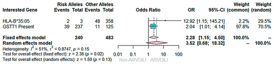 In this study, we aimed to observe the effect of multiple genes. Therefore, Mantel–Haenszel statistical analysis was applied in order to investigate the additional effect of interesting genes. After pooling the effects of GSTT1 and HLA-B*35:05 using fixed-effect Mantel–Haenszel statistics, results revealed that a combination of GSTT1 wild type and HLA-B*35:05 was significantly associated with a 2.28-fold increased risk of ARVDILI in the Thai population (pooled OR = 2.28; 95% CI: 1.01–4.14; p = 0.02), as illustrated in Figure 2.