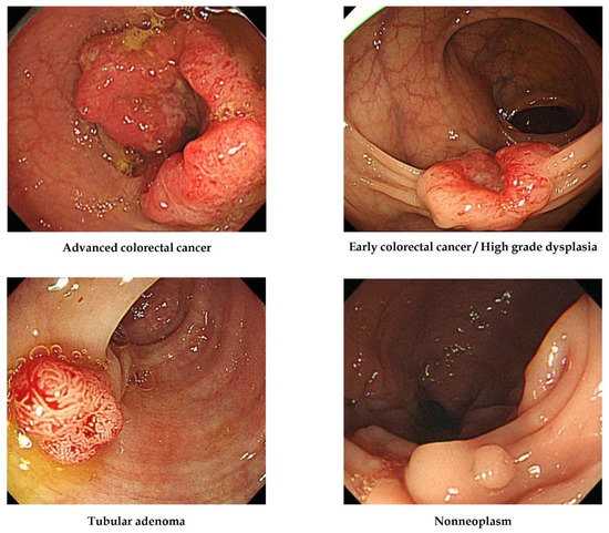 All images were labelled according to pathological evaluation following endoscopic or surgical removal. In the first labelling step, lesions were classified according to histology into one of the four following categories [15]: (1) adenocarcinoma, (2) TA with HGD (carcinoma in situ or intramucosal cancer), (3) TA with or without low-grade dysplasia, and (4) hyperplastic polyp, inflammatory polyp, lymphoid polyp, leiomyoma, lipoma, or non-neoplastic lesion. The clinical stage, including the invasion depth of the lesion, determined the therapeutic strategy, such as surgery or endoscopic removal, so lesions were then classified into four alternative classes: (1) ACC (stages T2, T3, and T4 cancers), (2) ECC/HGD (stage T1 cancers and high-grade dysplasias), (3) TA, and (4) non-neoplasm. No image was included in more than one histological class (i.e., all were mutually exclusive). Representative lesions are illustrated in Figure 1.
