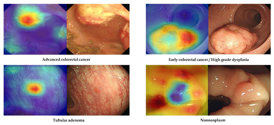 Representative cases of correctly determined classes in the external-test datasets using no-code tool 1. Left: gradient-weighted class activation mapping image. Right: white-light endoscopic image.