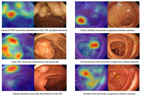Representative cases of incorrectly determined classes in the external-test datasets using no-code tool 1. Left: gradient-weighted class activation mapping image. Right: white-light imaging endoscopic image.