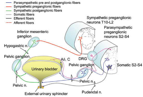 - Rahman, M.; Siddick, A. Neuroanatomy, Pontine Micturition Center. In StatPearls [Internet]; Updated 9 September 2021; StatPearls Publishing: Treasure Island, FL, USA, 2021. [Google Scholar]