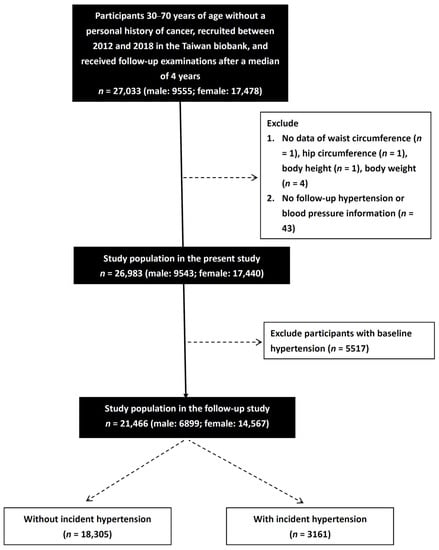 A total of 121,423 participants were included in the baseline study of TWB. We identified 27,033 participants (male: 9555; female: 17,478) in the TWB with follow-up data for a median of 4 years and excluded those with no data on WC (n = 1), HC (n = 1), BH (n = 1), and BW (n = 4), those with no follow-up data on hypertension or BP (n = 43), and those with baseline hypertension (n = 5517). The remaining 21,466 participants (male: 6899; female: 14,567) were enrolled (Figure 1), all of whom provided written informed consent.