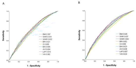 Comparison of the predictive value of nine obesity-related indices for diagnosis of incident hypertension among (A) males and (B) females.