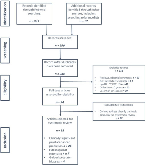 The review process employed for the current paper has limitations as well. Being a relatively newly developed domain, we could not extend the exclusion criteria, leading to an accentuate heterogeneity amongst selected papers in terms of study protocol (MRI magnetic field intensity, selected MRI sequences, targeting all identified lesions versus only index nodules and the choice of performing external validation), algorithm complexity (automated detection and characterization of the suspect lesions versus manual segmentation and texture analysis-based malignancy prediction) and ground truth reference (prostate biopsy cores versus radical prostatectomy specimen).