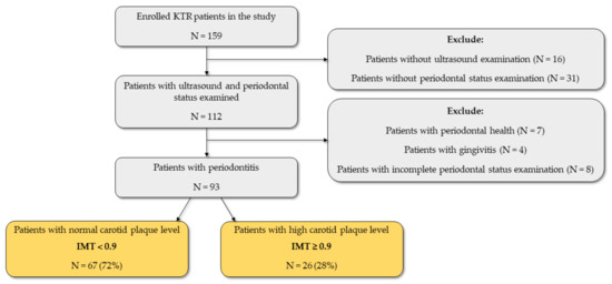 This study included 93 KTR patients. The exclusion criteria and number of excluded patients are presented in Figure 1. Data on basic characteristics, comorbidities, laboratory parameters, anthropometric, body composition, blood pressure, and ultrasound parameters, as well as periodontal status parameters, are shown in Table 1. To determine the significant level of IMT, we used an IMT cut-off of 0.9 mm. Sixty-seven (72%) KTRs had IMT < 0.9 mm, and 26 (28%) of them had IMT ≥ 0.9 mm. KTRs with IMT ≥ 0.9 were significantly older, had a lower level of total cholesterol, fat mass (kg), and end-diastolic velocity (EDV), and had fewer teeth. In addition, KTRs with IMT ≥ 0.9 mm had significantly higher values of pulse wave velocity (PWV) and resistive index (RI).