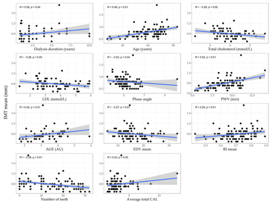 Correlations between IMT and measured parameters are shown in Figure 2 (only statistically significant parameters are shown). Positive correlations between IMT and duration of dialysis, age, PWV, AGE, RI, and average total CAL were found. On the other hand, negative correlations between IMT and total cholesterol level, LDL, phase angle, EDV, and number of teeth were found.