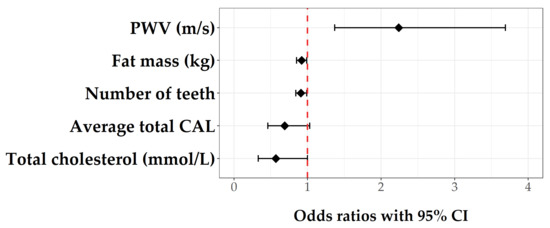 The final regression model showed that the greater odds of developing atherosclerosis in KTRs are associated with higher levels of PWV, lower fat mass, and fewer teeth. Average total CAL and total cholesterol levels were also selected to remain in the final model. However, these variables were not statistically significant (Figure 3). The total explained variance of the final model was 48.7%, with PWV alone contributing to 25.5%.