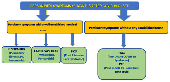 The term Long COVID has been conceptually used to identify the presence of any symptoms after COVID-19 infection and consists of two stages: (1) post-acute consequences of SARS-CoV-2 infection (PASC) or acute post-COVID infection (from week 5 to week 12 after the onset of symptoms) and (2) Long COVID (for symptoms lasting more than 12 weeks). Moreover, the recurrence of features after COVID-19 diagnosisshould be recorded, as it remains pertinent to determine the pattern (variations) and nature (new onset or worsening) of any symptoms [5].
