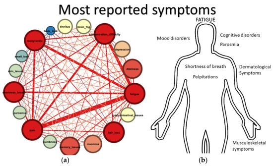 (a) Network Analysis graph of persistent symptoms. Larger nodes imply higher degree centrality. (b) Most frequently reported symptoms in Greek Long COVID society (LCGr).