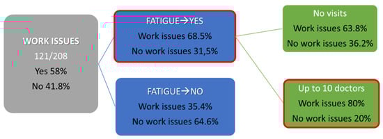 The decision tree analysis shows clearly that fatigue is a key factor which is positively related to employment issues. Patients who report occupational issues show higher rates of fatigue and visited a higher number of medical professionals in order to be diagnosed and treated (Figure 5).