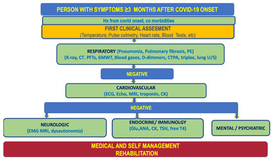 There is now a consensus that Long COVID is a multi-systemic entity that requires multiple partners to care for patients. Moreover, a number of symptoms could be attributed to several systems, and therefore there is a need for a thorough differential diagnosis and a collaboration of multiple medical experts. Namely, shortness of breath is mainly attributed to respiratory disorders: Given that COVID-19 is a virus that primarily affects the respiratory system residual dyspnea is usually attributed by both patients and health care professionals to pneumonia or fibrosis caused by the infection. However, dyspnea could be caused additionally by cardiovascular disorders and deconditioning. Therefore, a careful differential diagnostic algorithm should be followed before the treatment of dyspneic Long COVID patients with CPET having a central role. Moreover, palpitations, which relateto tachycardia could be caused by hypoxemia, hyperthyroidism, cardiovascular disease, or neurological diseases such as Postural Orthostatic Tachycardia Syndrome (POTS) and dysautonomia. The identification of autonomic dysfunction following COVID-19 infection involves the careful evaluation of the individuals expressing breathlessness, palpitations, fatigue, chest pain, presyncope, or syncope [1]. In this aspect, we proposed a diagnostic algorithm by adapting already used algorithms with data from the Greek Long COVID cohort in order to target the Greek population and its characteristics (Figure 6).