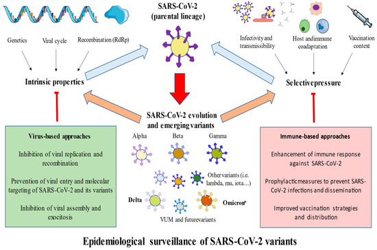 A general picture of the evolution and emergence of SARS-CoV-2 variants. As shown, due to the intrinsic properties of the virus (genetics, recombination, and viral cycle) and selective pressure (host and immune coadaptation, infectivity and transmissibility efficacy, and the actual vaccination context), a set of variants has been developing with enhanced features compared to their parental lineages, including greater transmission, infection rates, or circulation. Of them, currently Delta and Omicron are considered VOCs, where Omicron * represents the dominant variant worldwide. Simultaneously, there may be novel variants appearing, as well as further lineages of previously established variants. To limit the impact and slow the continuous evolution of SARS-CoV-2, virus- and immune-based approaches and, more prominently, prophylactic measures and improved vaccination strategies are needed.