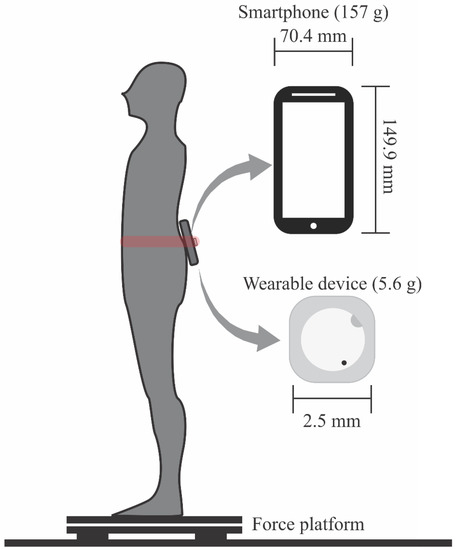 Scheme of the experimental setup. The participant was requested to keep in a quite standing position on a force platform. A smartphone and wearable were fixed in the lumbar region using an elastic strap. Panels highlight the dimensions of the smartphone and wearable device.