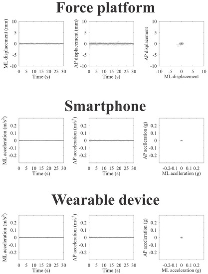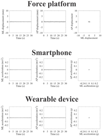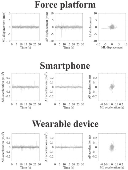 Figure 2, Figure 3 and Figure 4 represent the recordings of body sway in open eyes, closed eyes, and unipedal support conditions from the participants using the force platform (upper panels), smartphone (intermediate panels), and wearable device (lower panels), respectively. Individual recordings are in gray on each panel, and the grand-averaged recordings are in black. In a visual inspection, we can observe large oscillations and variability along the anteroposterior axes for all devices and experimental conditions, as we expected.
