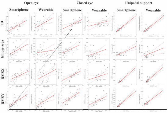 Table 2 shows the mean values (and standard deviations) of the quantitative parameters of the static balance evaluation using each device under the different experimental conditions. Table 3 shows the Pearson product-moment correlation coefficients for the linear correlation between the quantitative parameters obtained from the force platform and the corresponding parameter estimated from the inertial sensor of the smartphone and the wearable device. The statistical significance of the correlation was considered an indicator of the validity of the inertial device. Figure 5 shows the correlation plots between the force platform measurements and the inertial measurements in the several experimental conditions.