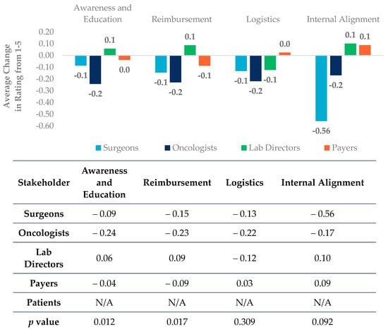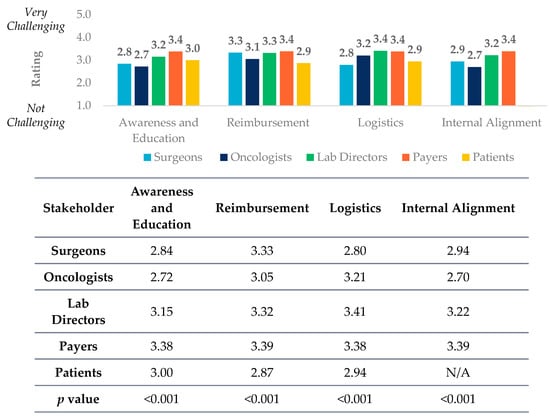 All five stakeholders have significantly (p < 0.01) different viewpoints about education and awareness (which includes recognition of clinical utility) of different biomarker testing types. Payers view education and awareness challenges as a highest barrier in total amongst all of the stakeholder groups (Figure 1).