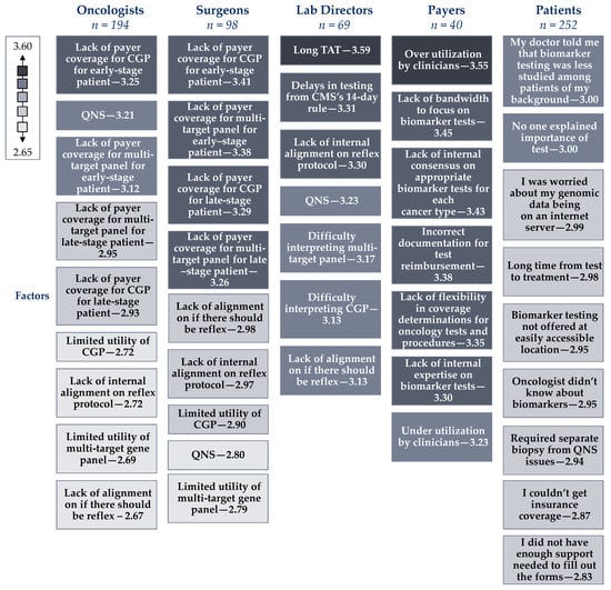 Lab directors, oncologists, surgeons, payers, and patients (n = 653) were asked the following question with different responses. Please rate how challenging the following factors are to biomarker testing for oncology targeted therapies on a scale of 1 to 5, where 1 is not challenging and 5 is very challenging. Responses are listed in order of largest to smallest challenge and shaded grey based on the legend from 2.60–3.60. Note: QNS = Quantity Not Sufficient defined as not enough specimen for a laboratory to perform the requested tests. TAT = Turn-around-time defined as the time taken from specimen collection to laboratory test results being reported. CMS = Centers for Medicare and Medicaid Services. CMS’s 14-day rule requires a clinical laboratory to seek reimbursement for testing ordered within 14 days of patients discharge.