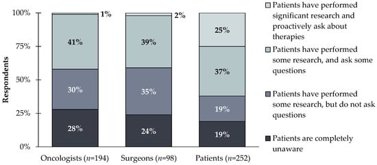 Surgeons and medical oncologists assume most patients are uninformed about biomarker testing. In contrast, many patients show high confidence in their level of awareness. Only ~2% of clinicians compared to 25% of patients believe that patients have performed significant research and proactively ask about therapies (Figure 3).