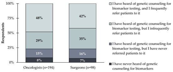 Oncologists and surgeons (n = 283) were asked the following question: Which of the following best describes your level of awareness of genetic counseling to support biomarker test ordering and results reporting? 77% of both oncologist and surgeon respondents report to being aware of genetic counseling for biomarker testing and referring patients at some point either frequently or infrequently.
