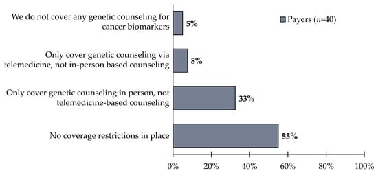 Payers (n = 40) were asked the following questions: Which of the following best describes your plan’s coverage of genetic counseling to support biomarker test ordering and results reporting? 55% of respondents reported having no coverage restrictions in place, but notably 33% of respondents report not covering telemedicine-based genetic counseling.